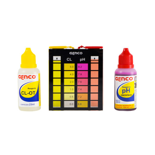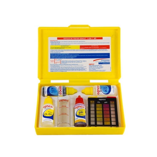 Estojo de Testes GENCO® “3 em 1” – OT mede cloro livre, pH e alcalinidade total da água da piscina de maneira rápida e simples.